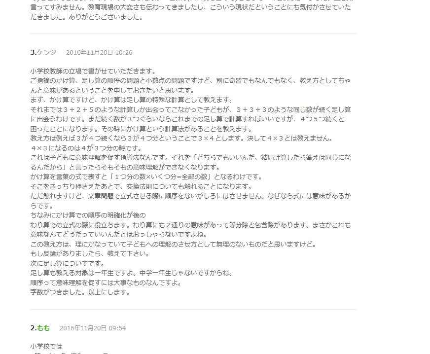 119 匿名さん 17/06/01(木) 01:18 小学校の算数において、奇妙な「正解」を押し付けるのは、子どもの精神に対する虐待であり、許されることではない。そのような、奇習を押し付けている小学校教育界の人たちは、自分たちの愚鈍を恥じ、反省し、改めて欲しいと思う