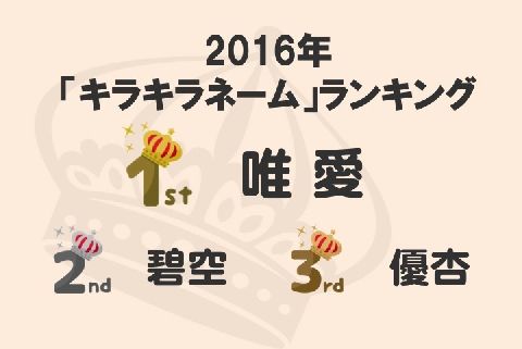 2016年の「キラキラネームランキング」が発表された。1位は「唯愛(いちか、ゆめ)」、2位は「碧空(みらん、あとむ)」となった。その他に「黄熊(ぷう)」など、読み方が難しい名前もランクインした
