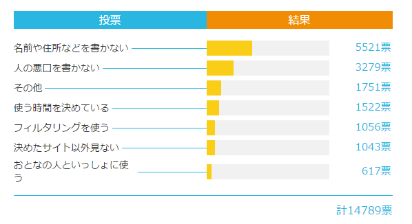 インターネットを使うときのルールについて、先生やまわりのおとな、友だちと話し合ったことはあるかな? そのとき、どんなルールに決まったのか、あてはまるものをすべて選んでね。 そのルールになった理由も、ぜひ教えてね! 名前や住所などを書かない 5521票 人の悪口を書かない 3279票 その他 1751票 使う時間を決めている 1522票 フィルタリングを使う 1056票 決めたサイト以外見ない 1043票 おとなの人といっしょに使う 617票
