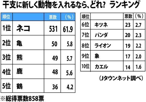 圧倒的な差で1位に輝いたのは、ネコだった。61.9%、過半数をはるかに超える支持を集めた。全国の中で、33都道府県でトップとなった。 やっぱりね、という人は多いだろう。干支に「新メンバー」入れるなら? 3位「熊」2位「亀」1位はやっぱり... - Jタウン研究所 - Jタウンネット