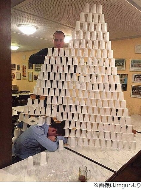 米ソーシャルサイト・imgurなどに投稿されたのは「Passing out first」、“初酩酊”と訳せるような写真。ジョッキなどが見えるテーブルに突っ伏した男性の上に、合計17段、200個以上のコップを見事に積み上げている。