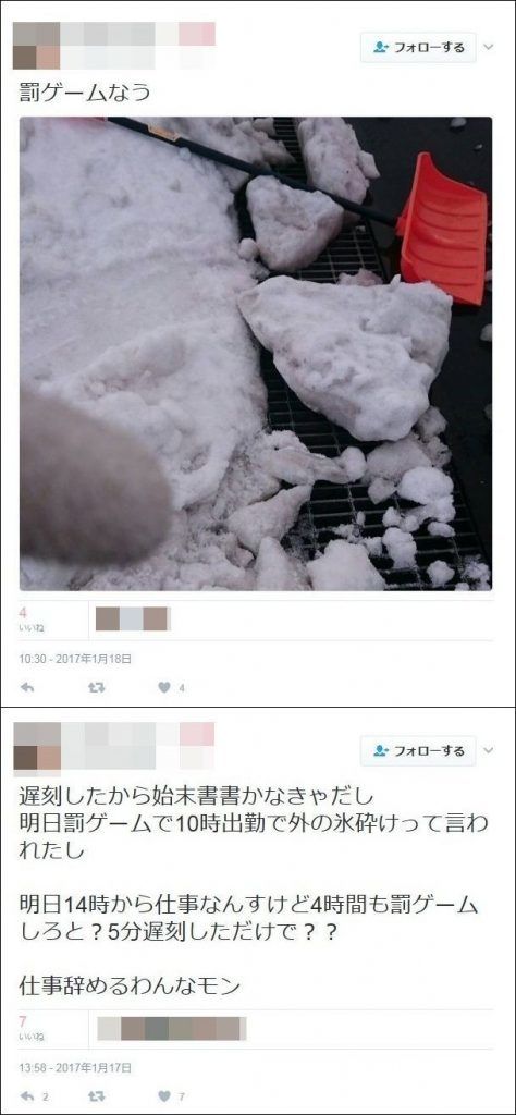 これまでは、「罰ゲーム制」が採用されていたという。草むしりや雪かきが中心で、シフト時間外に雑用を命じられることもあったそうだ。1月中旬には、5分の遅刻に対して「外の氷砕け」と4時間の作業を指示され、「仕事辞めるわんなモン」と社員は不満を表明した。しかも、罰ゲームを実際にやらされるのは、夕方の時間帯に勤務する店員ばかりだという。