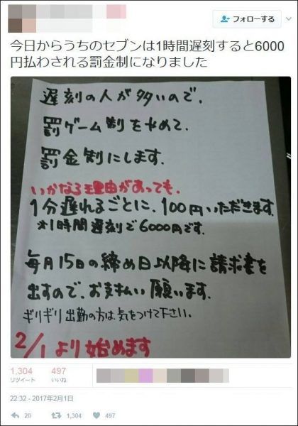 「今日からうちのセブンは1時間遅刻すると6000円払わされる罰金制になりました」。そして、その告知を撮影した画像を公開。遅刻する店員が多いため、罰金制の導入が決まったらしいが、店長らは先日の騒動を知らないのではないかという。罰金制の導入はやめるべきだと店長に伝え、それでも無理ならば本部に連絡すると、社員は記した。