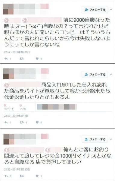 従来も、商品をレジ袋に入れ忘れて客に渡し損ねたままになったら、担当した店員がその商品を買い取ることになっていたそうだ。お釣りの金額を間違えて、客に余分に渡してしまった場合には、その差額は店員が自腹で店に払っているとのこと。過去には、9000円を自身が負担したこともあるという。このような場合は「店で負担してほしい」と、社員は主張する。
