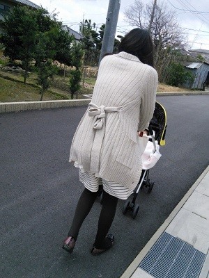 ベビーカーを荷物入れにして抱っこしているのは何?