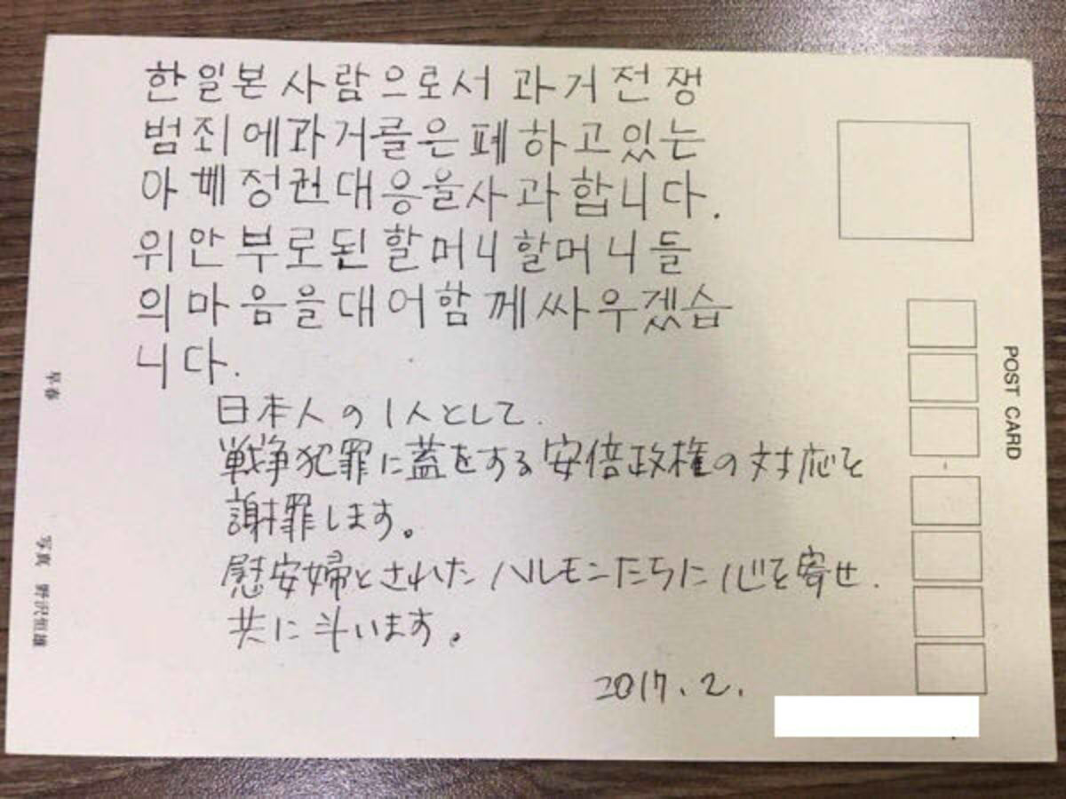 韓国・釜山の日本総領事館前に設置されている慰安婦像に、安倍政権への批判や慰安婦を支持する文面の手紙やはがきが複数置かれたとする報道があり、はがきについては差出人…