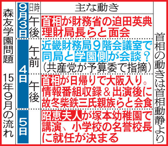 + 拡大する 森友学園の土地取引に関する動きと安倍晋三首相の日程に、微妙にリンクする面があると、ネット上で話題になっている。 発端は24日の衆院予算委員会。共産党が15年9月4日、近畿財務局で局側と学園側が協議したのではないかと指摘した。財務省は記録は残っていないと述べたが、首相動静によると、首相は前日の3日に官邸で財務省の理財局長と面会。4日午後には大阪を訪れ、テレビ出演や会食を行った。学園との接触記録はないが、国会会期中では異例の日帰り訪問と報じられた。昭恵夫人は自身のSNSで学園での講演の写真を5日にアップしている。首相動静が森友学園側の動きと微妙にリンクと話題に - 社会 : 日刊スポーツ