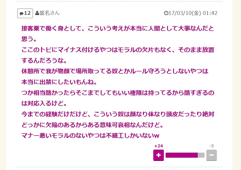 24 匿名さん 17/03/10(金) 09:56 サービス業したことあるか、ないかにもよるかも?自分も飲食店でバイトしてみて、自分がされたら嬉しいことをしてあげようと思うようになった。また洗うだろうけど、洗っておいた方がお店の人も少しは楽だろうな、と思うから洗う。