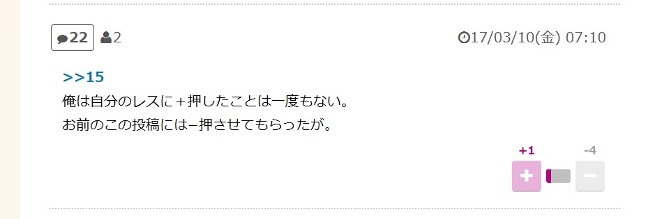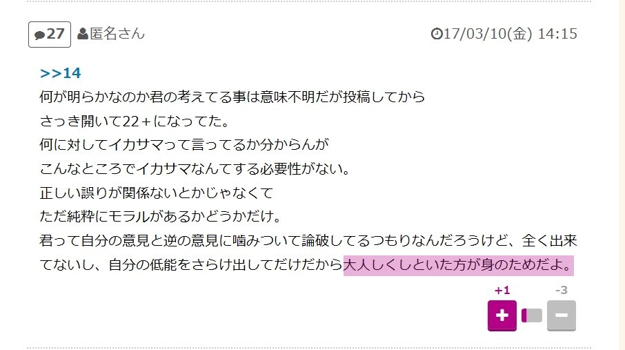 27 匿名さん 17/03/10(金) 14:15 >>14 何が明らかなのか君の考えてる事は意味不明だが投稿してから さっき開いて22+になってた。 何に対してイカサマって言ってるか分からんが こんなところでイカサマなんてする必要性がない。 正しい誤りが関係ないとかじゃなくて ただ純粋にモラルがあるかどうかだけ。 君って自分の意見と逆の意見に噛みついて論破してるつもりなんだろうけど、全く出来てないし、自分の低能をさらけ出してだけだから大人しくしといた方が身のためだよ。