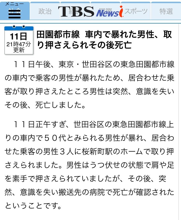 8 匿名さん 17/03/12(日) 18:16 その場にいた人のTwitterの内容じゃ押さえてる人が怒ってたらしくかなり強くやってたみたいだよ 気道は確保してと言ってたみたい 打ち所とかではなく取り押さたことによる胸の圧迫かなと思う 本当かどうかはわからないけど事実なら殺人事件。こんな事が正当防衛になってほしくない