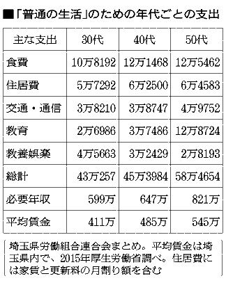 埼玉県内で人並みに暮らすには月約50万円の収入が必要で、子供が大学に入ると支出が急に増え、奨学金がないと成り立たないとする調査結果を、県労働組合連合会(埼労連)と有識者がまとめた。「賃金の底上げとともに、教育や住宅の負担を下げる政策が必要」と指摘している。 【30代夫婦で小学生と幼稚園児】さいたま市郊外で月5万5千円の賃貸住宅(2LDK、約43平米)で暮らす1カ月の生活費は▽食費約10万8千円▽交通・通信費約3万8千円▽教育費約2万7千円などの計約43万円となった。 たとえば洗濯機は約6万円のものを国税庁の決まりをもとに耐用年数を6年として割り算し、月額を836円とするなどして、家具・家事用品の月額負担は1万8356円と積算した。 08年の前回調査と比べ、教育費と教養娯楽費が合計で3万円近く増えたほか、交通・通信費も1万円余り増えるなど、約6万8千円増えた。この支出のためには、税や社会保険料を加えた額面で、約50万円の月収(年収約599万円)が必要だ。しかし、厚生労働省の調査によると埼玉県内の30代男性の平均年収は約411万円と、200万円近い開きがある。 【40代で中学生と小学生】30代より食費と教育費がそれぞれ約1万円増える一方、教養娯楽費は約1万3千円減るなどした結果、額面の月収は約54万円(年収約647万円)が必要。平均の485万円との差は少し縮まる。 【50代で大学生と高校生】東京の私大に通わせる前提で▽教育費が40代よりも約9万円多い約13万円▽交通・通信費も同1万1千円多い約5万円と大きく増える。教養娯楽費を30代より1万7千円余り少ない約2万8千円に抑えるが、全体の支出は約58万円で、税などを加えた額面は約68万円(年収約821万円)と、平均の545万円を276万円上回る。 調査をまとめた静岡県立大学短期大学部の中沢秀一准教授は「妻のパートでは足りず、子供は奨学金を借りる。無償の奨学金や住宅補助の制度を充実させないと子供の将来はさらに厳しい」と指摘している。(松浦新)埼玉で人並みの生活、月収50万円必要 県労連が調査:朝日新聞デジタル