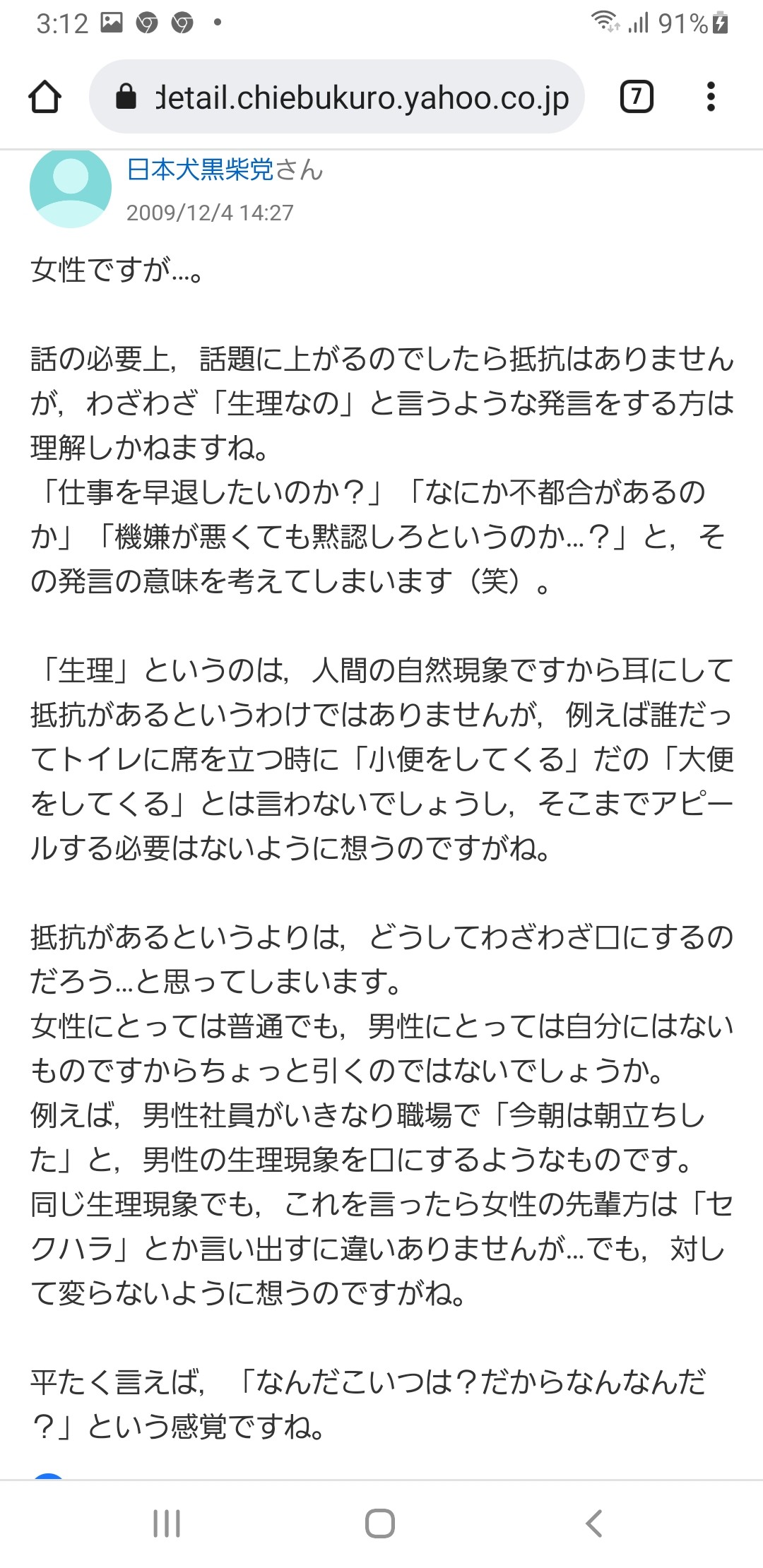 ある男が、職場で中途採用で入ってきた女複数に生理の話をされましたって言ってて、その流れなんだけど。