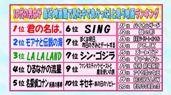 1位に選ばれたのは、記録的な大ヒットになった『君の名は。』だった。 『君の名は。』をつまらないと感じた理由には、「映像は本当にきれいだったが、ストーリーが散らかっていて感情移入出来なかった」などの声が。映像や音楽の満足度は高いものの、ストーリーに不満を持つ10代の観客もいたようだ。1位はあの大ヒット作! 10代が選ぶ「つまらなかった映画」ランキング