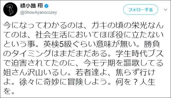 物議を醸しているようで・・・・・・バンド「氣志團」のメンバー、綾小路翔さん(41歳、DJ OZMAとしても活動)が、ツイッターで「今になってわかるのは、ガキの頃の栄光なんてのは、社会生活においてほぼ役に立たないという事。英検5級ぐらい意味が無い」などとツイー